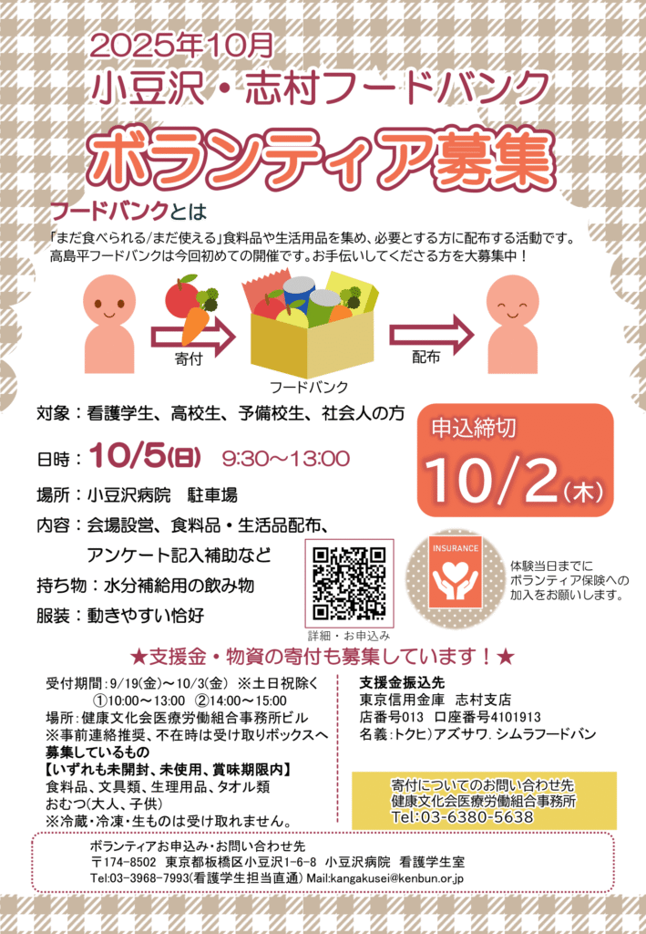 小豆沢病院にて行われる「小豆沢・志村フードバンク」のお手伝いをしてくださるボランティアを募集します!