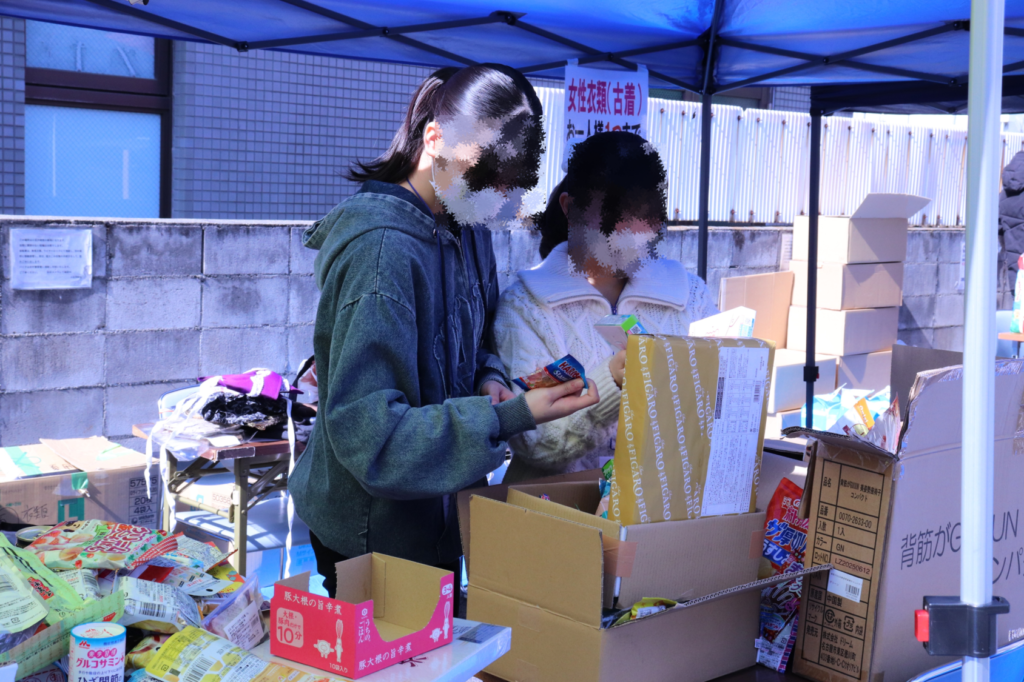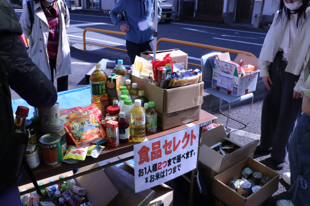 当日はお天気に恵まれ、たくさんの来場者の方におひとりずつ食べ物や日用品をお渡ししました。