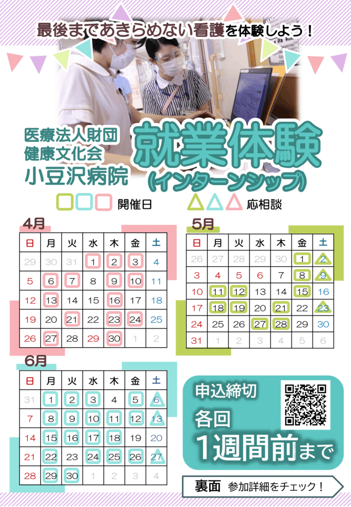内容:現場体験(約3時間)、法人説明、病院施設見学